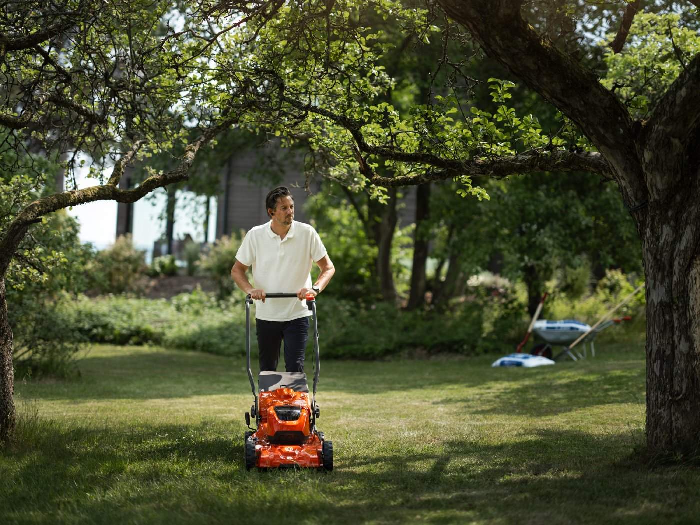 Dankzij de inklapbare bedieningsboom kan de grasmaaier worden opgeslagen of getransporteerd om ruimte te besparen.