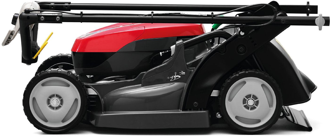 | Dankzij de inklapbare bedieningsboom kan de grasmaaier worden opgeslagen of getransporteerd om ruimte te besparen. |